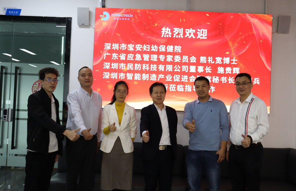 深圳市宝安妇幼保健院实验室主任熊主任、深圳市民防科技有限公司董事长施贵辉、深圳市智能制造产业促进会联席秘书长李想兵一行莅临深圳市K8官网生物科技有限公司参观访问